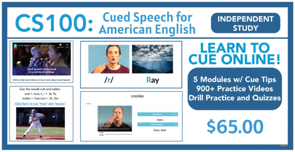 Get started right away with CS100 – Cued Speech for American English (formally titled Introduction to Cued American English) – Self-Study. CS100 is comprised of 5 modules, including a comprehensive introduction, followed by 14 lessons that cover all of the handshapes and hand placements of Cued American English, as well as basic rules, or “Cue Tips”, which govern use of the system. Students are provided with plenty of opportunities to memorize and practice the system: In total, students have access to over 900 videos demonstrating how to cue a wide range of phonemes (sounds), syllables, words, and phrases. This guided practice enables students to memorize the entire system, fine-tune their form, and develop a good beginning level of fluency. Get started today! It generally takes 15-25 hours to initially complete the course, but a full year of access is included with purchase.